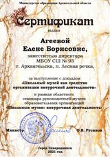 -выступление с докладом «Школьный музей как средство организации внеурочной деятельности» в рамках областного семинара руководителей музеев образовательной организации, г.Северодвинск, 2021г.(Сертификат);