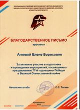 -Благодарственное письмо Регионального отделения Всероссийского детско-юношеского военно-патриотического общественного движения «Юнармия» Архангельской области, 2022г.;